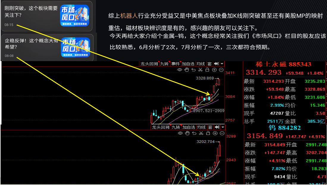 还行呀各位股友,8月8日的钨,8月15日的稀土永磁都是今天大涨的板块。钨分享了四次,一次没错.....分享的板块可以耐心点,我不太喜欢高位的,即使追涨也是追在起点。