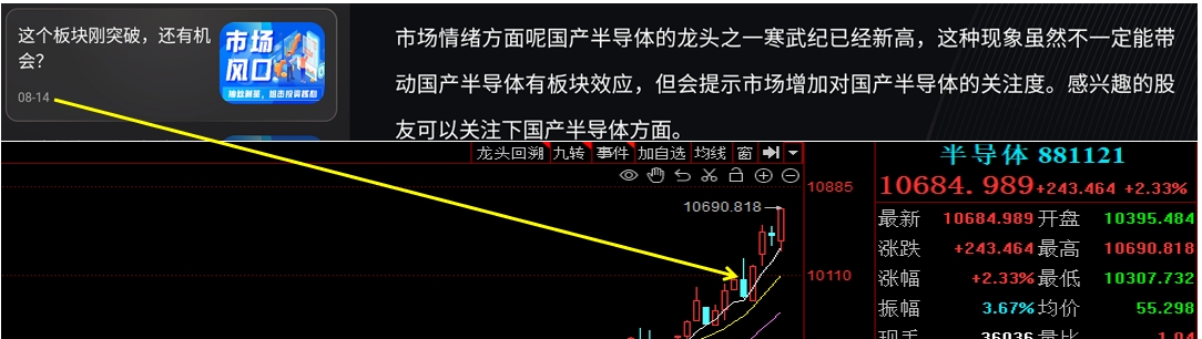 还有半导体,8月14日板块阴线提示。逻辑就是AI补涨以及寒武纪突破带来的关注度提升,回过头来看逻辑非常正确哈!