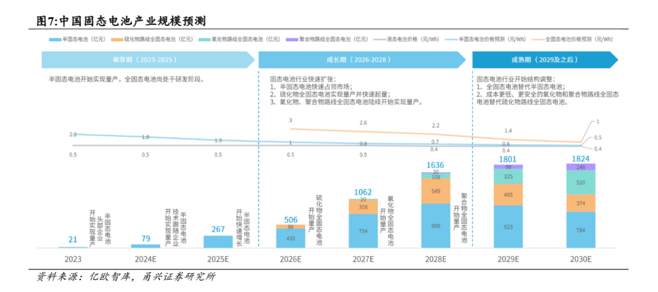 根据亿欧智库,2026-2028年是不同技术路线全固态电池实现量产的关键阶段,其中硫化物路线有望在2026年率先实现量产。2029年之后,随着全固态电池价格下降,固态电池产业将进入成熟期的结构调阶段。预期2030年全固态电池产业规模超1000亿元,固态电池产业规模超1800亿元。