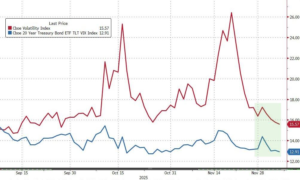 尽管劳动力市场出现疲软迹象——据ADP研究显示,11月美国企业裁员规模为2023年初以来最大——但市场对经济韧性的信心依然支撑着当前的低波动率环境。