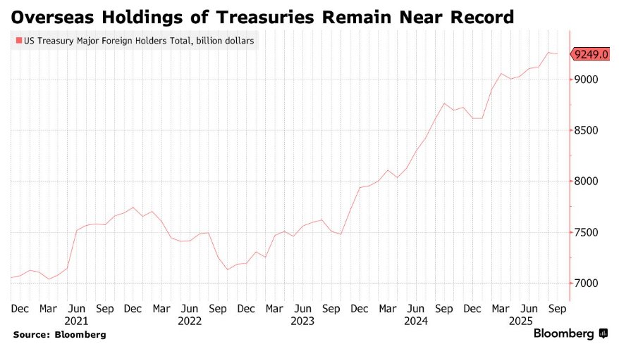 智通财经APP获悉,美国政府结束停摆之后公布的最新美债持仓数据显示,9月份海外国家所持有的美国国债规模仍接近历史最高位,这也意味着此前不久在8月创下新的美债持仓历史最高位之后,海外国家整体持有的美国国债规模仅仅呈现出略有回落。最新的海外国家美债持仓凸显出那些嘴上说着“抛售美国”与“美国例外论已经处于崩塌进程”的海外主权财政机构以及大型私人投资机构们实际上正在趁着美债价格在降息预期催化之下的上行时期疯狂买入美债资产或者在收益率反弹时候趁机大举逢低买入美债。