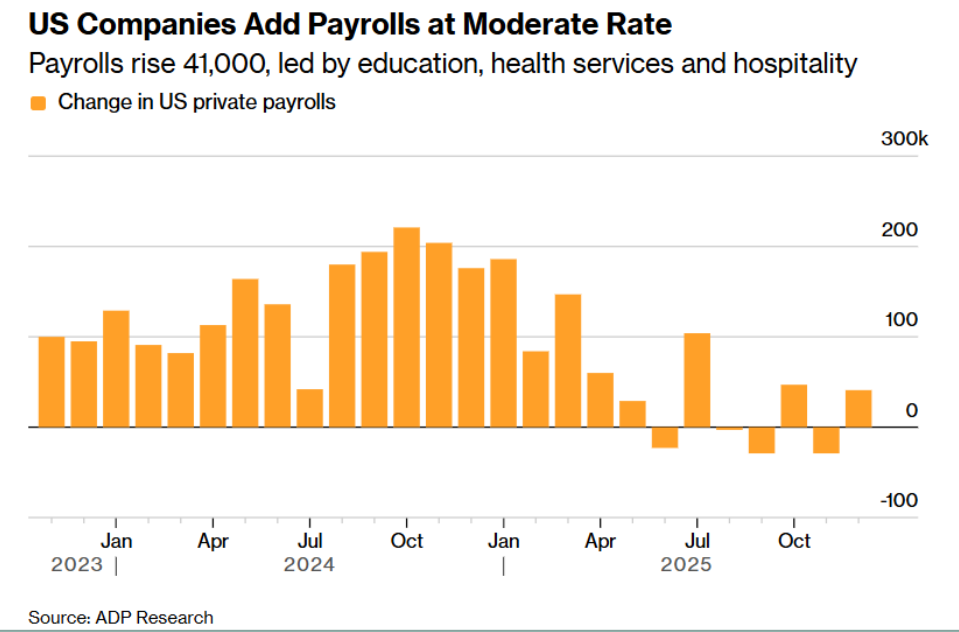 周三公布的“小非农”数据——即ADP Research美国私营部门就业数据,也释放出关于美国劳动力市场的相对积极信号。美国私营领域在12月的整体就业人数增加4.1万人,此前一个月曾出现显著下降,凸显出美国企业在12月的招聘步伐以温和速度小幅度回升,表明迈入2026年前的美国经济仍然韧性十足。相比之下,12月“小非农”不及更加乐观的市场一致预期,一项面向经济学家们的调查显示,经济学家普遍预期为增加约5万人。