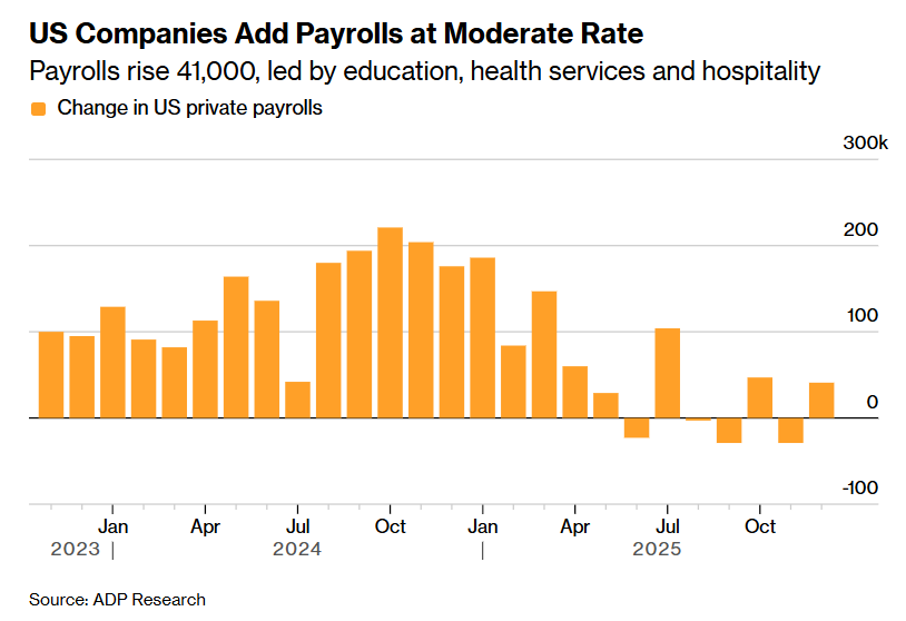 ADP 12月私营部门新增4.1万人且较11月(修正后-2.9 万)显著回升,但又略低于市场普遍预期,确实呈现出一种“招聘降温但未全面失速”的微妙平衡状态——既没有强到让市场担心“需求过热以至于通胀猛兽回头导致降息预期大降温”,也没有弱到像重大经济衰退信号那样立刻击穿美国经济“软着陆”这一宏大叙事。