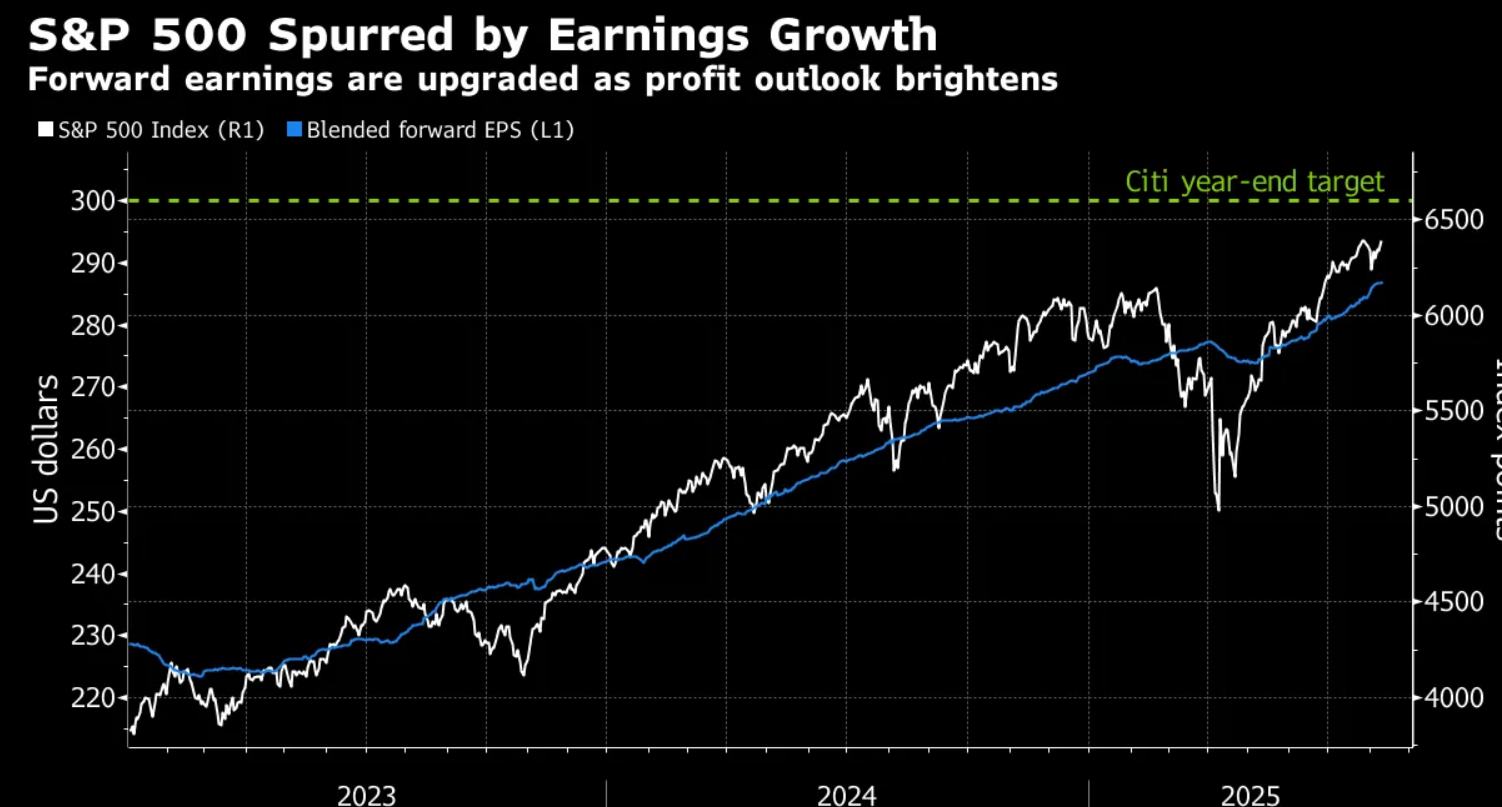 在这份看涨美股的研报中,花旗策略师团队将标普500成分股的每股收益预测上调:2025年每股收益由此前的261美元升至272美元,2026年每股收益由295美元上调至308美元。花旗的策略师们写道,更高的利润预测并未引发对估值假设的实质性大规模调整。对于更长期的美股牛市展望,他们预计标普500指数将在2026年年中升至6,900点,较当前水平再上涨约8%。