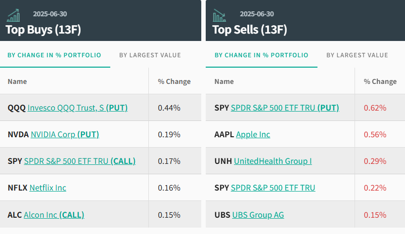 从持仓比例变化来看,瑞银第二季度的前五大买入标的为:纳斯达克100指数看跌期权(QQQ.US,PUT)、英伟达看跌期权(NVDA.US,PUT)、标普500指数看涨期权(SPY.US,CALL)、奈飞(NFLX.US)以及Alcon Inc看涨期权(ALC.US,CALL)。