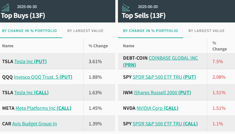 值得注意的是,在上述的前十大持仓中,野村第二季度同时大幅加码 TSLA 看跌期权(Put)、看涨期权(Call)以及特斯拉正股,其背后的逻辑可能在于“做多波动 + 动态对冲”的大事件型交易;野村用两端期权押二季度的大幅波动(交付/财报/叙事冲突),用正股做 Delta/Gamma 管理;在上行叙事仍具想象、下行基本面仍有压力的特斯拉身上,这种“保留凸性、兼顾防守”的组合,是标准的机构打法,用于押注某只股票价格将呈现出剧烈波动。