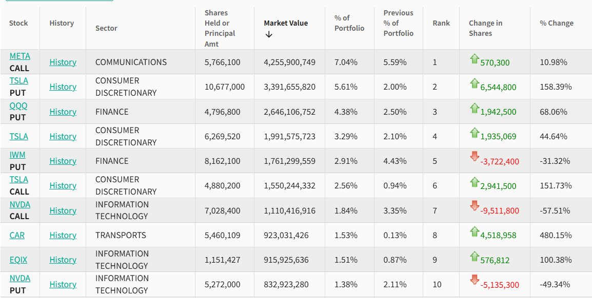 从持仓比例变化来看,野村第二季度的前五大买入标的为:特斯拉(TSLA.US,PUT)看跌期权、纳斯达克100指数看跌期权(QQQ.US,PUT)、特特斯拉看涨期权(TSLA.US,CALL)、Meta(META.US,CALL)看涨期权以及Avis Budget Group Inc (CAR.US)。