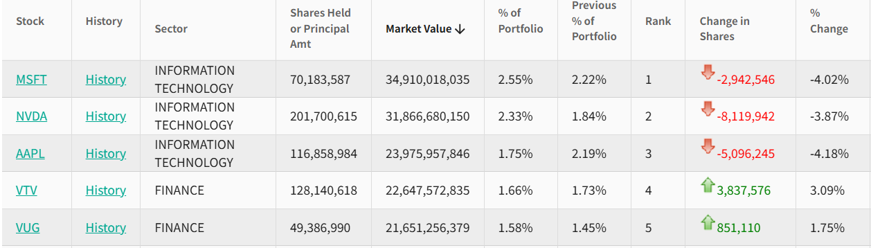 在前五大重仓股中,微软(MSFT.US)位列第一,持仓约7018.3万股,持仓市值约为349.1亿美元,占投资组合比例为2.55%,较上季度的持仓数量减少4.02%。