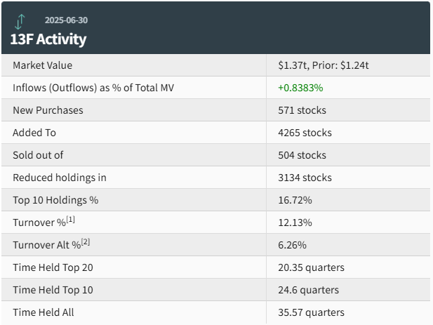 Vanguard价值股ETF(VTV.US)位列第四,持仓1.28亿股,持仓市值约为226.5亿美元,占投资组合比例为1.66%,较上季度的持仓数量增加3.09%。