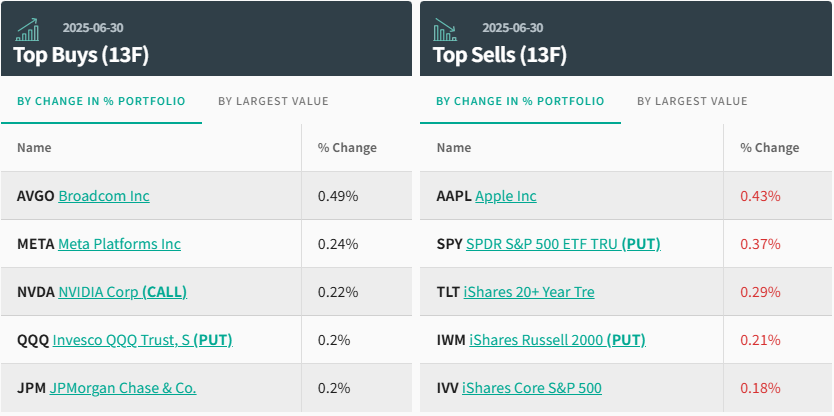 从持仓比例变化来看,前五大买入标的分别是:博通(AVGO.US)、Meta Platforms(META.US)、英伟达看涨期权(NVDA.US,CALL)、纳斯达克100指数ETF看跌期权(QQQ.US,PUT)、摩根大通(JPM.US)。