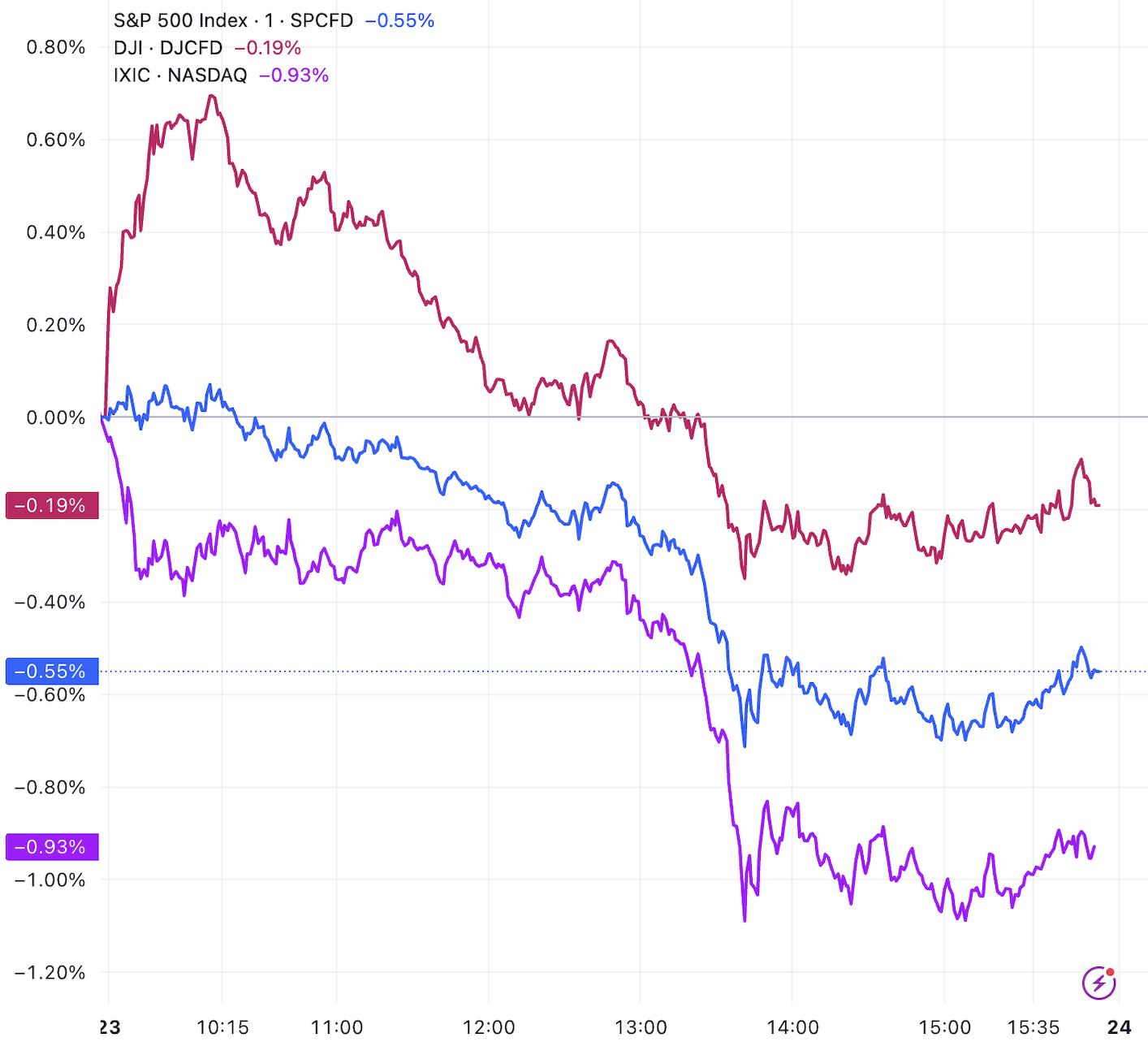 截至收盘,道琼斯指数跌0.19%,报46,292.78点;标普500指数跌0.55%,报6,656.92点;纳斯达克指数跌0.95%,报22,573.47点。