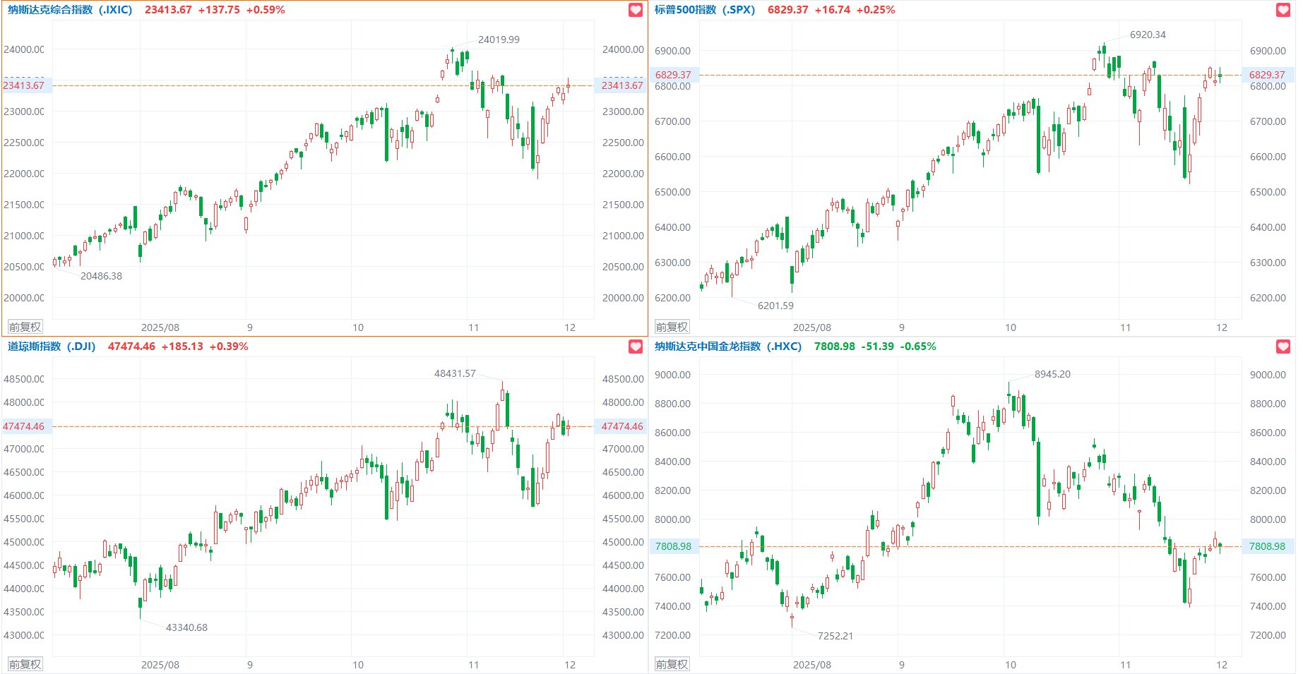 半导体设备与材料、加密储备概念涨幅居前,Strategy、康特科技涨超5%,阿斯麦涨近2%,Coinbase涨超1%。黄金股、能源板块走低,美国能源跌超5%,金田、黄金资源跌超3%,泛美白银、科尔黛伦矿业跌超2%,埃克森美孚、雪佛龙跌超1%。波音大涨超10%,创4月份以来最大单日涨幅,公司预计明年将恢复现金流。
