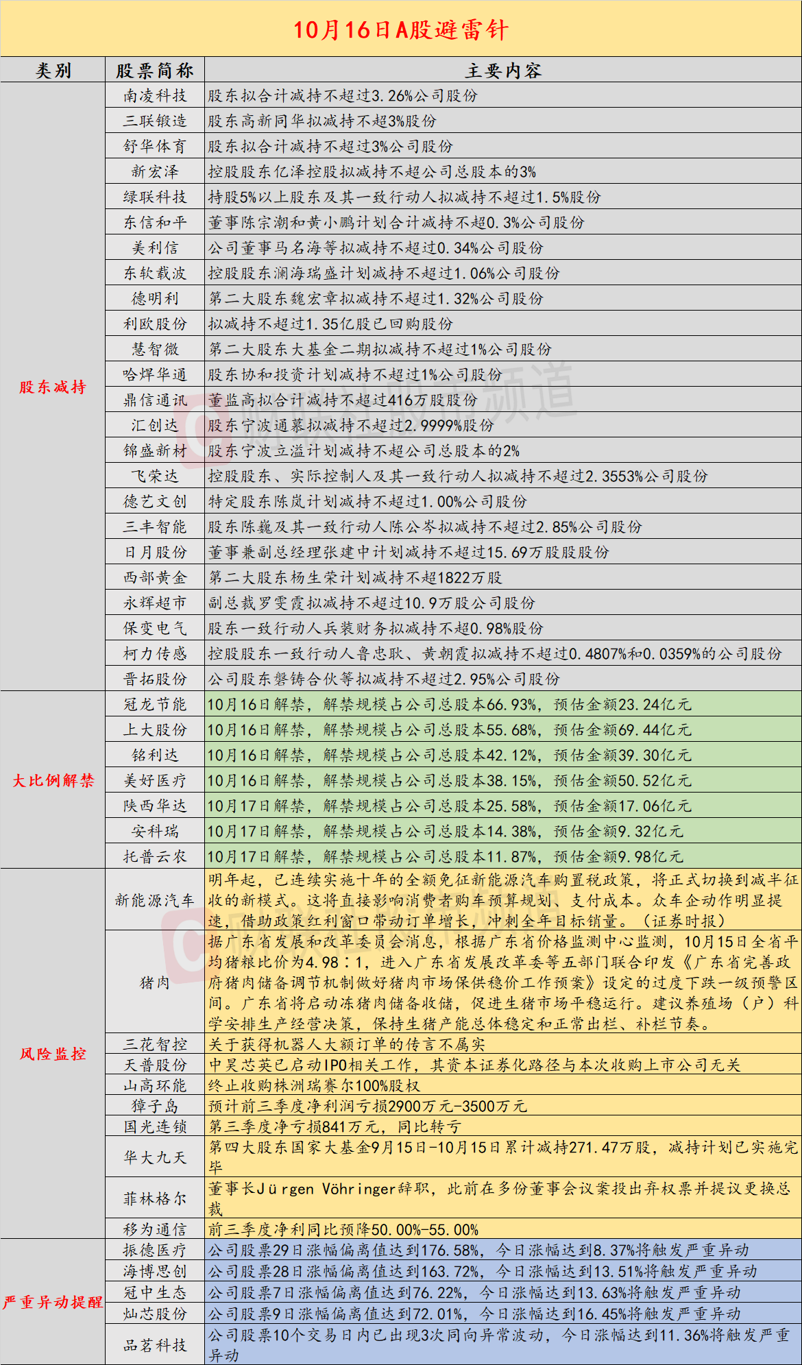 投资避雷针,近日,A股及海外市场潜在风险事件如下。国内经济信息方面包括:1)新能源汽车购置税明年退坡;2)广东省猪粮比价进入过度下跌一级预警区间;公司方面重点关注包括:1)三花智控公告,关于获得机器人大额订单的传言不属实;2)天普股份表示,中昊芯英已启动IPO相关工作,其资本证券化路径与本次收购上市公司无关;海外市场重点关注包括:1)美股三大指数收盘涨跌不一,稀土概念跌幅居前;2)全球公共债务占GDP的比重将创1948年以来新高。