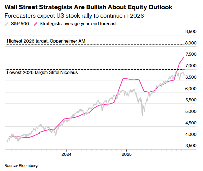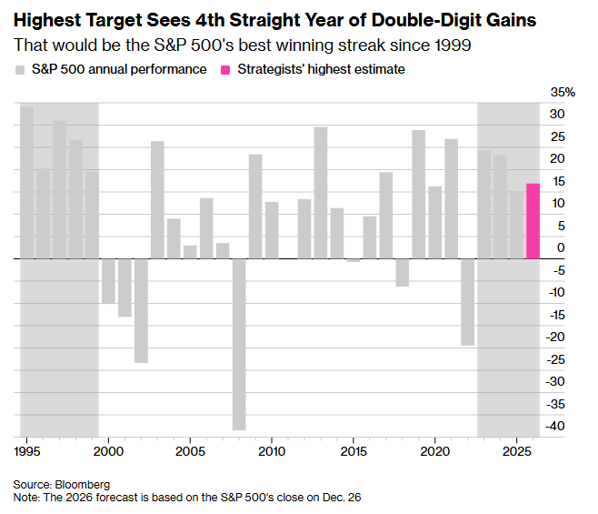 如果华尔街预测人士对2026年的判断是正确的,那么美股将迎来自全球金融危机前夕以来最长的一段年度连涨周期。若其中最高的目标得以实现,也将标志着标普500指数自上世纪90年代互联网泡沫以来,首次出现连续四年实现两位数涨幅。