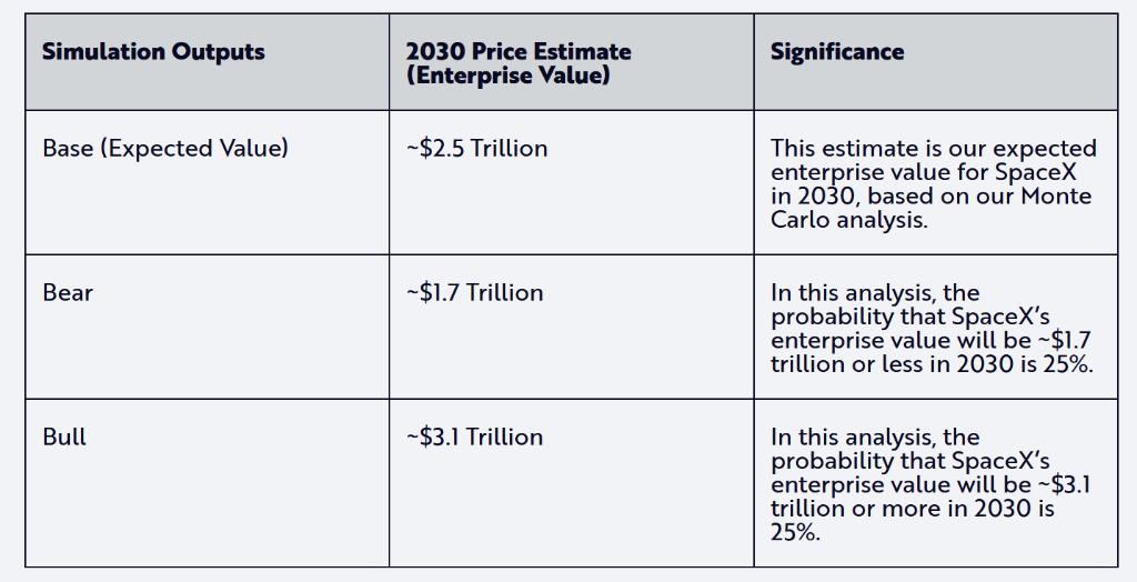 市场的狂热并非凭空而来。回溯至2025年6月10日,知名投资人、“马斯克长期支持者”“木头姐”(Cathie Wood)旗下的ARK投资管理公司就发布了一份开源估值模型报告,预测SpaceX的企业价值到2030年有望达到约2.5万亿美元。