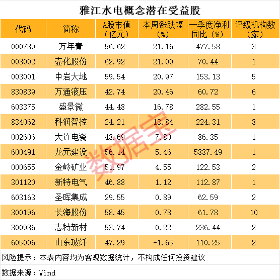 随着雅江水电概念行情的扩散,一些潜在受益股值得关注,尤其是小市值高成长标的,后续弹性或较大。根据华泰证券研报,数据宝统计出市值在70亿元以下、一季度净利同比增长超60%且有机构评级的受益股,合计有14只。