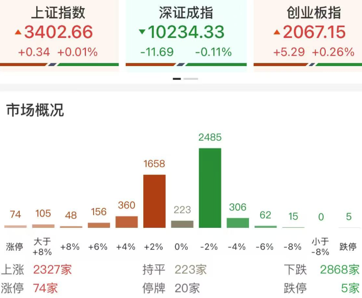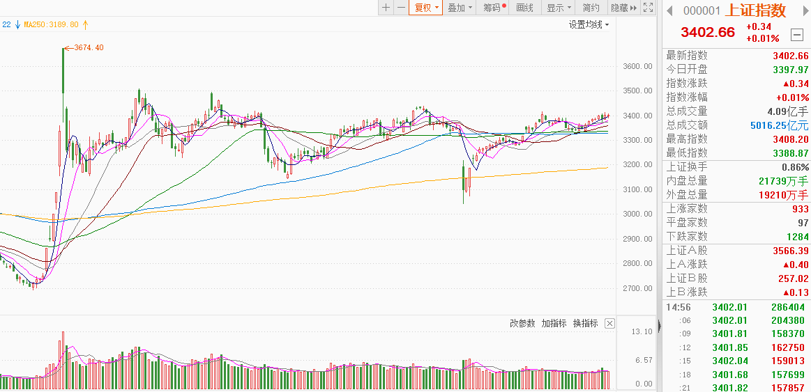 大盘分析及后市展望:周四,A股冲高回落,沪指围绕3400点拉锯,创业板领涨。板块轮动明显,昨日早盘领跌的美容护理板块今日领涨,昨日走弱的可控核聚变,早盘处于涨幅榜前列。午后,创新药、固态电池、黄金等板块走强;半导体、芯片、证券等板块回落,股指回落。权重股方面,保险、银行上涨约1%,为大盘翻红助力;证券冲高回落。总体看,沪指再度冲破3400点,但市场增量资金不明显,难以站稳。