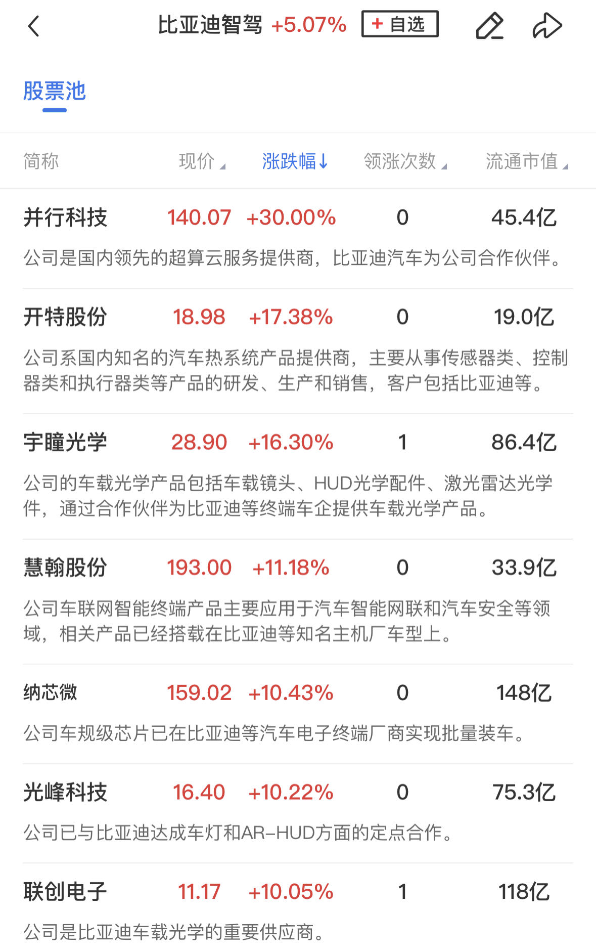 比亚迪智驾概念股维持强势,联创电子、世运电路、伯特利、大为股份等个股涨停,宇瞳光学、慧翰股份、纳芯微、科博达等个股涨幅居前。