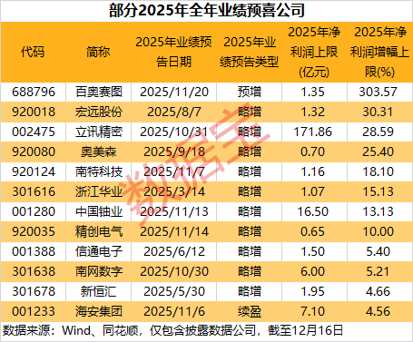 人民财讯12月16日电,目前,已有部分公司率先披露2025年全年业绩预告。根据Wind及同花顺数据显示,截至12月16日,近20家公司(不含类型为“不确定”的公司)披露2025年全年业绩预告。整体来看,预喜(预增、略增、续盈)公司有13家,占比近七成。按照业绩预告上限来看,近期上市的百奥赛图2025年全年净利润上限有望达到1.35亿元,净利润增幅上限超过300%。宏远股份、立讯精密、奥美森等6家公司2025年净利润增幅上限均超过10%,其中,宏远股份净利润增幅上限略超30%,立讯精密净利润增幅上限超过28%。