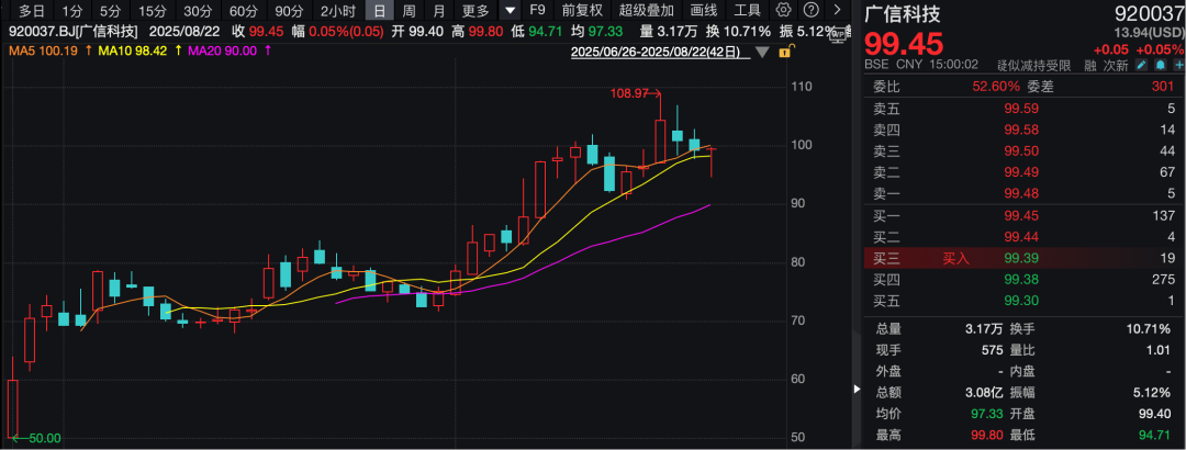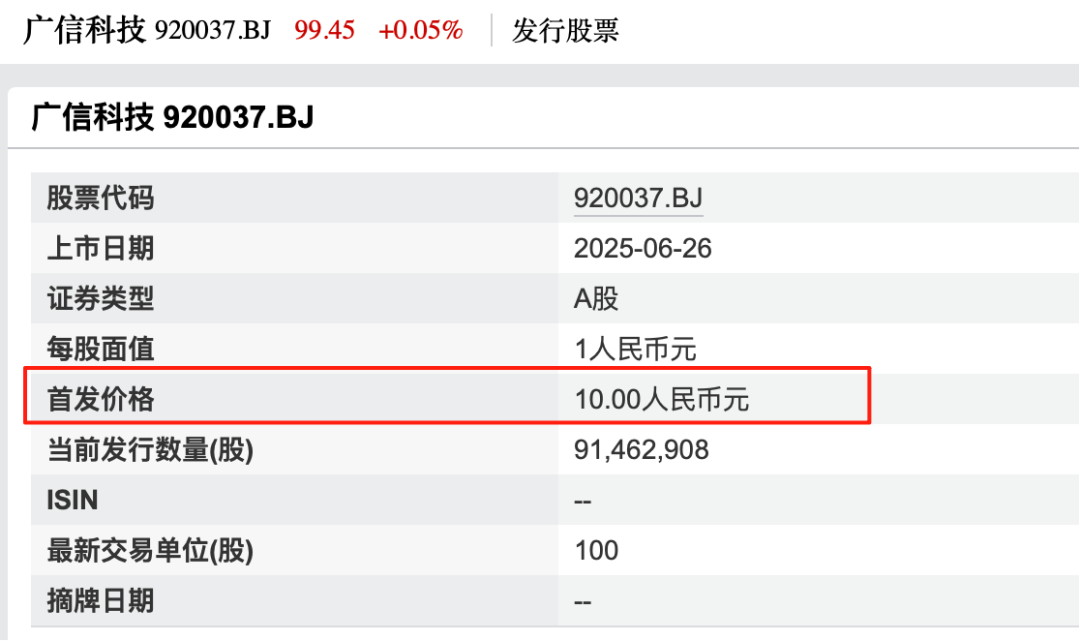 广信科技于2025年6月26日登陆北交所,上市后公司股票走势相当耀眼,近日公司股价一度突破100元/股,是其发行价10元/股的10倍。截至8月22日,该股总市值接近91亿元,其中流通市值为29.4亿元。