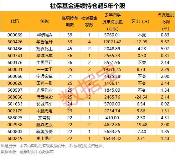 社保基金持有期限最长的个股是华侨城A,自2011年二季度以来已累计持有59个季度,最新全国社保基金四一三组合,位列公司第六大流通股东,持股量合计为5760.01万股,占流通股比例为0.83%,社保基金持有期限较长的还有华鲁恒升扬农化工中国巨石等,已连续持有53、45、36个季度。