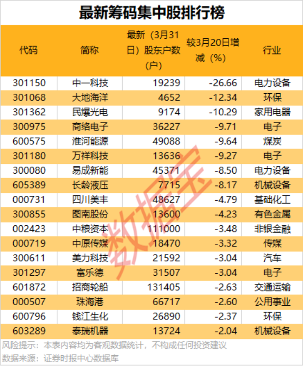 股东户数降幅最多的是中一科技,截至3月31日最新股东户数为19239户,较3月20日下降26.66%;大地海洋民爆光电股东户数环比分别下降12.34%、10.29%。