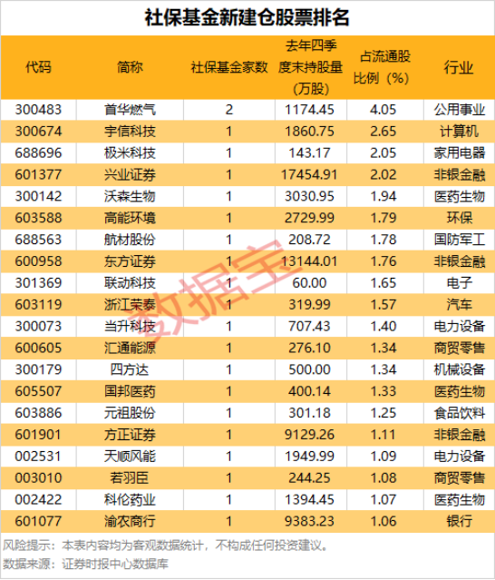 从持股比例看,新进股中社保基金持有比例最多的是首华燃气,持股量占流通股比例为4.05%;其次是宇信科技,社保基金持股比例为2.65%;持股比例居前的还有极米科技兴业证券沃森生物等。