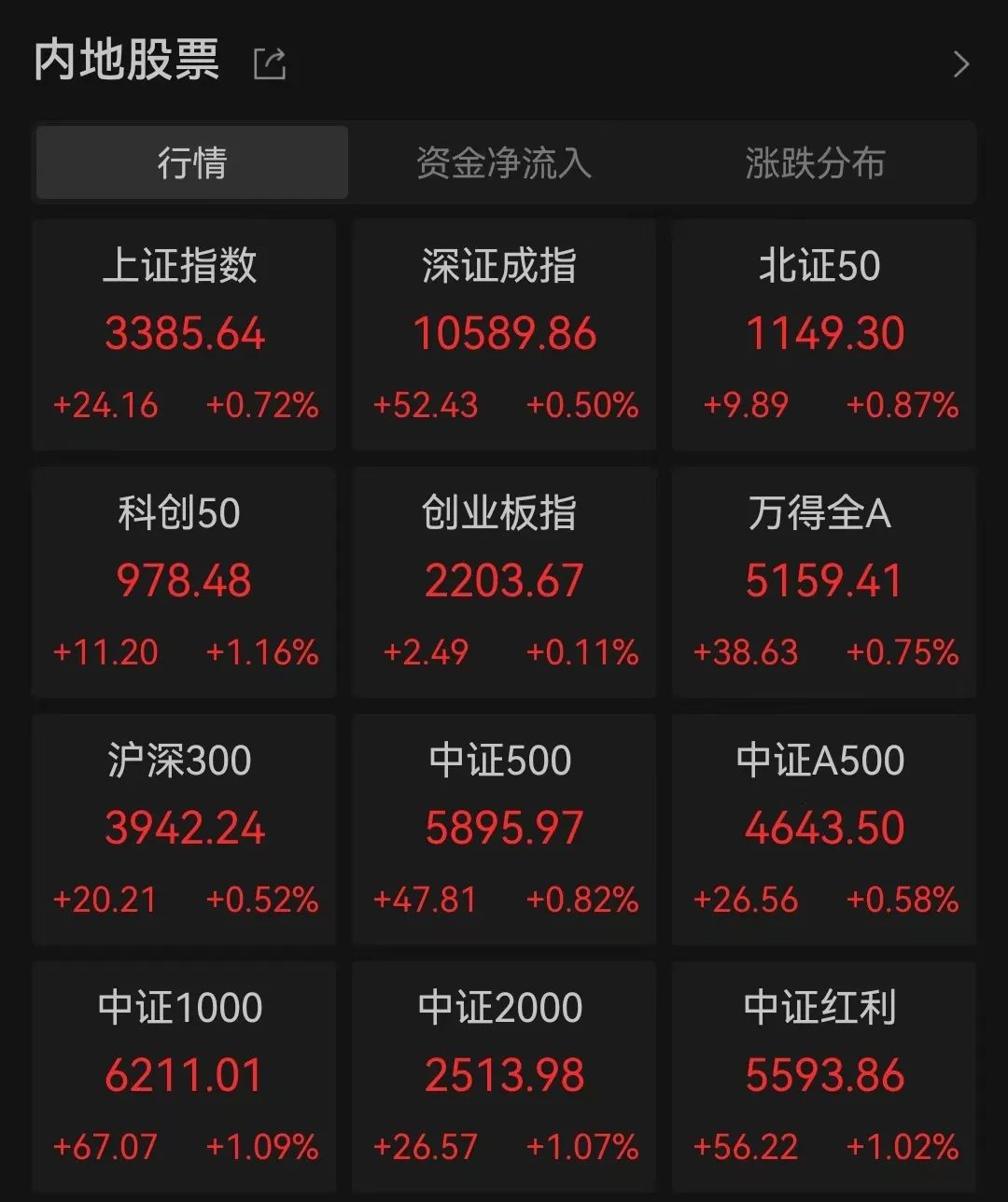 A股市场今天上午整体上行,主要指数不同程度上涨。截至中午收盘,上证指数上涨0.72%,深证成指上涨0.50%,创业板指上涨0.11%。