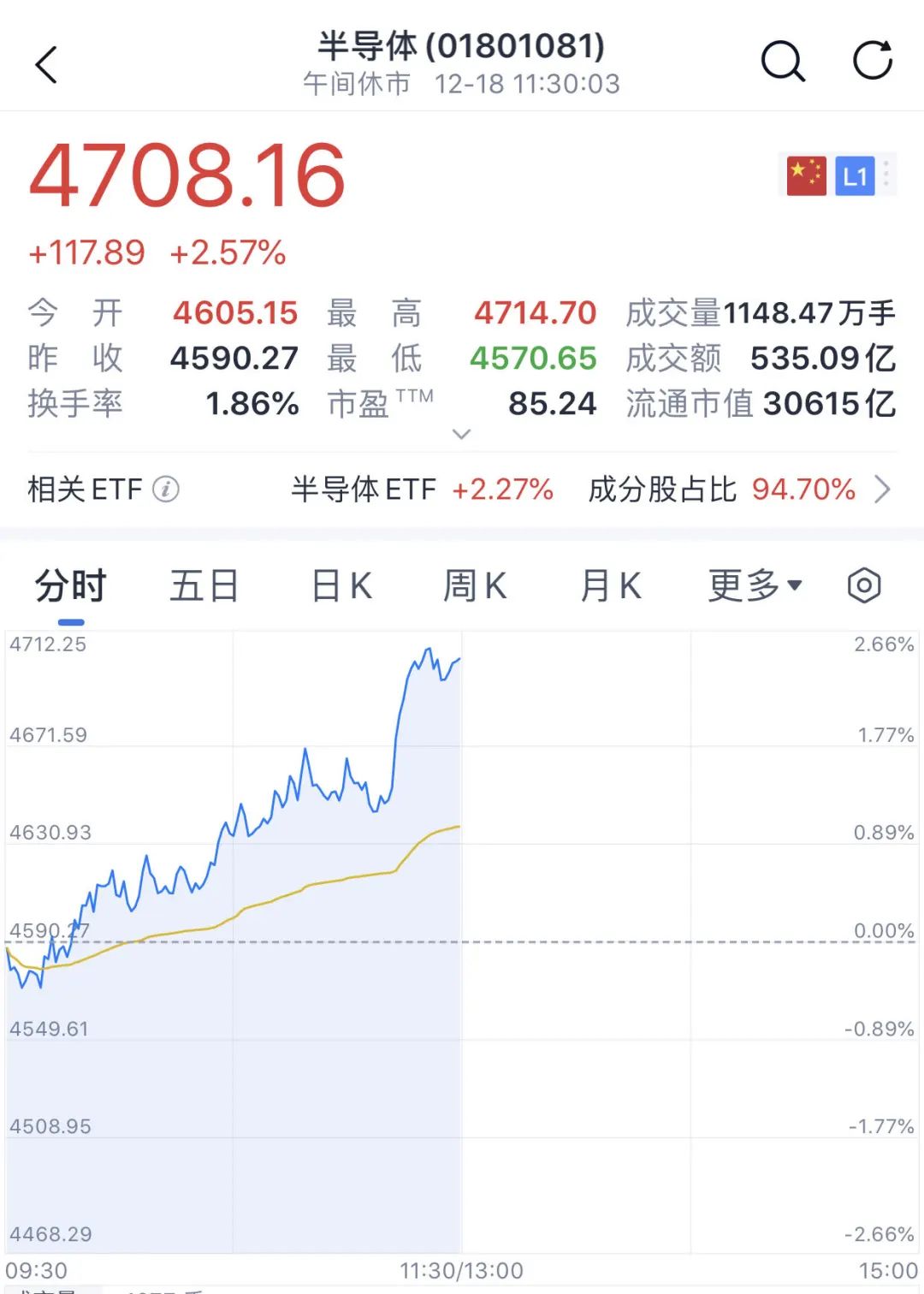 盘面上,半导体板块临近午盘大幅拉升,板块盘中涨幅超过2.5%,传媒板块涨幅居前;中字头、人脑工程、量子科技等概念表现活跃。