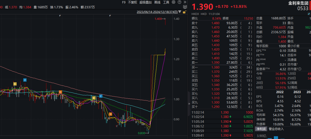 其他大幅波动的港股中,金利来集团复牌大涨,盘中涨幅一度超过14%。