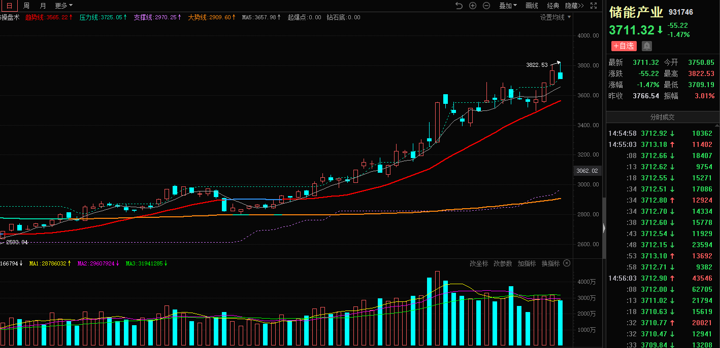 储能板块指数日K线显示,储能板块目前在走中期趋势上涨行情,股价依托经纬操盘指标红色趋势线重心逐步上移,上涨时带量突破,回调时缩量整固,每次回踩红色趋势线就再次反身向上,中期上升趋势保持完好!