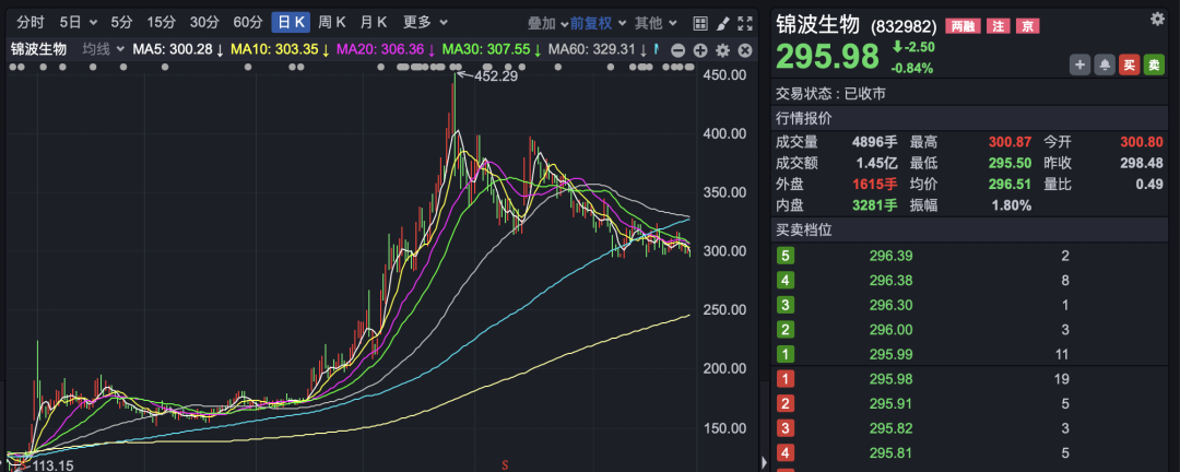 二级市场上,锦波生物今年上半年走出一轮大涨行情,股价涨幅翻倍,一度成为北交所“市值一哥”。近期该股有所走弱,9月19日收报295.98元/股,总市值为341亿元,略低于贝特瑞。
