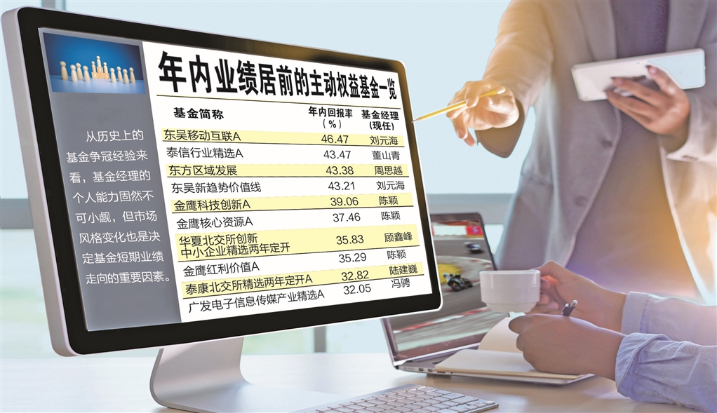 截至12月7日收盘,重仓传媒影视股的泰信行业精选A以45.14%的年内回报登上主动权益基金排名之首。而到了12月8日收盘,重仓通信、电子、计算机的东吴移动互联A单日净值大涨5.44%,凭借46.47%的年内回报将泰信行业精选A挤至次席。