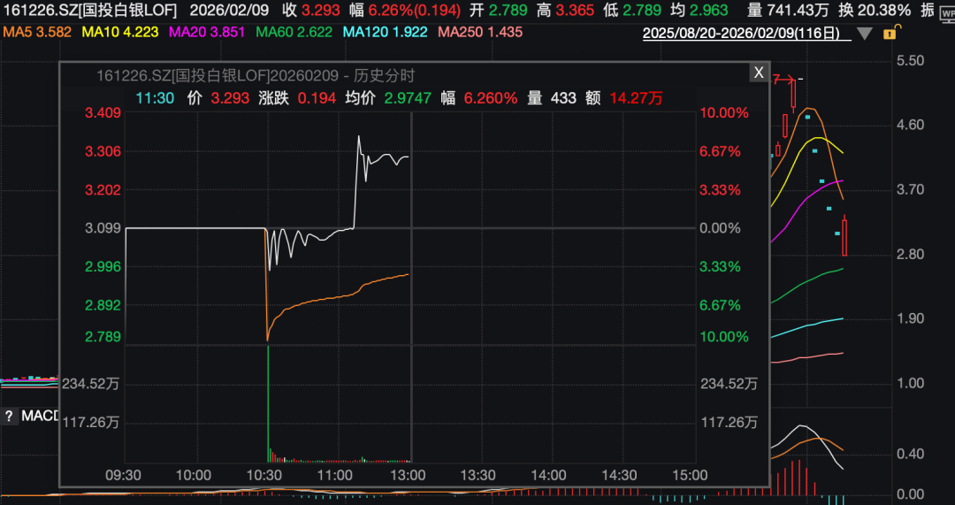 在连续5个跌停后,国投白银LOF今天(2月9日)上午复牌触及跌停后震荡走高,打开跌停板,盘中,该白银基金一度直线拉升,涨超8%。截至上午收盘,国投白银LOF涨6.26%,成交额超过20亿元,较此前几个交易日明显放量。
