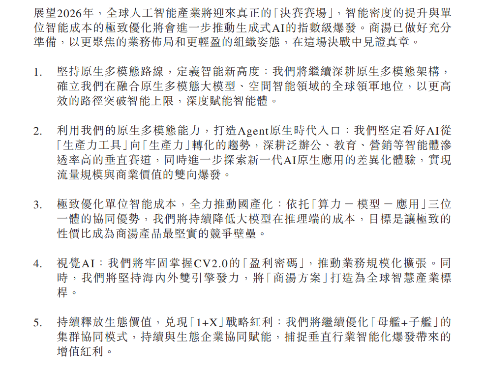 展望2026 年,商汤将继续深耕原生多模态架构,确立商汤在融合原生多模态大模型、空间智能领域的全球领军地位;同时抢占原生AI智能体市场先机,实现流量规模与商业价值的双向爆发,也将全力推动国产芯片适配,持续降低大模型的推理成本。