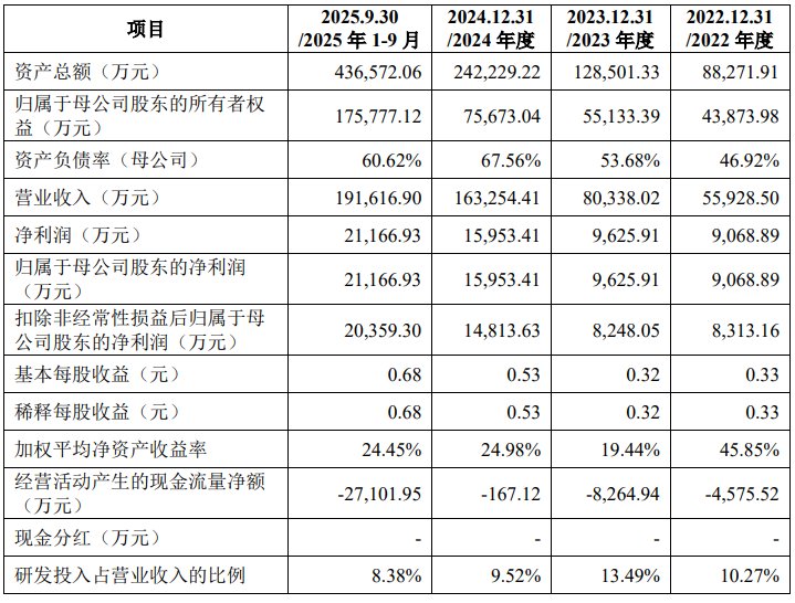 财务方面,于2022年度、2023年度、2024年度及2025年1-9月,公司实现营业收入分别约为5.59亿元、8.03亿元、16.33亿元、19.16亿元人民币;同期,净利润分别约为9068.89万元、9625.91万元、1.6亿元、2.12亿元人民币。