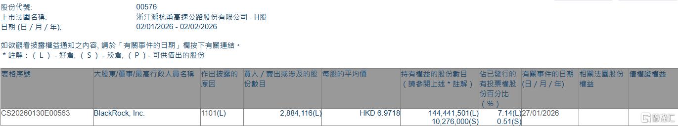 格隆汇2月2日丨根据联交所最新权益披露资料显示,2026年1月27日,浙江沪杭甬(00576.HK)获BlackRock, Inc.在场内以每股均价6.9718港元增持好仓288.41万股,涉资约2010.75万港元。