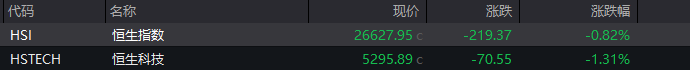 恒生指数开盘跌0.82% 恒生科技指数跌1.31%
