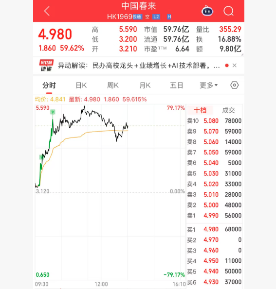 上证报中国证券网讯 1月30日,民办高校龙头中国春来放量大涨,涨幅一度高达79%,截至14时00分报4.98港元/股,上涨59.62%,成交额达9.8亿港元,较前一交易日的成交额327万港元大幅放量。