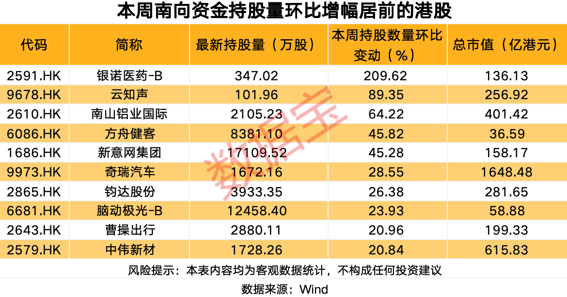 人民财讯2月1日电,从持股量变化来看,最近一周10只个股获得南向资金持股量环比增长超20%,银诺医药-B居首,环比增长209.62%,其他还有云知声、南山铝业国际、方舟健客持股量环比增幅居前,持股量环比增幅分别为89.35%、64.22%、45.82%。