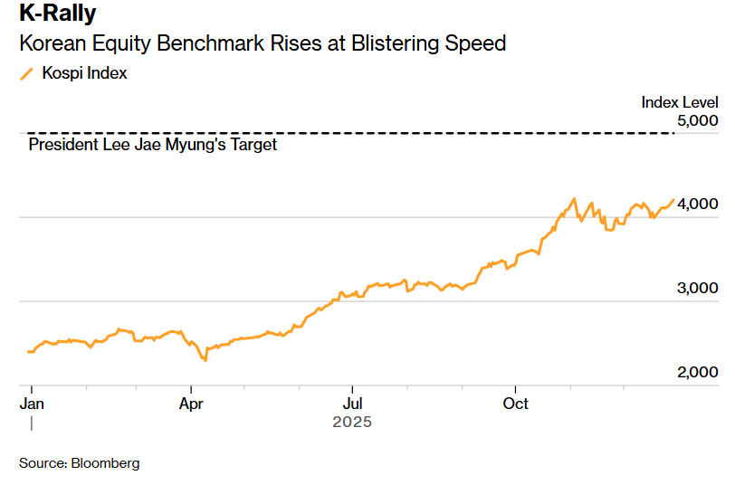 正如上图所显示的那样,韩国股市的这股“K-Rally”可谓席卷全球——韩国股市基准Kospi指数以惊人速度持续上行。韩国总统李在明甚至在近期预言韩国股市不久后将突破5000点超级关口。截至周一收盘,韩国Kospi指数收于4220点。若周二早盘的强劲上涨势头延续,韩国股市将再创历史新高。