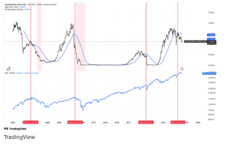 智通财经APP获悉,自1997年以来,3个月期美国国债收益率与美国垃圾债券利差之间的比率一直100%可靠地精准预测着每一次美国经济衰退,且从未出现过误报。该指标最近跌破了其100周的周移动平均线,随后反弹,这预示着未来几个月非常有可能出现经济衰退,毕竟29年来这项指标没有出现过误报。比率跌破100周均线并且小幅反弹后的下行轨迹,正是该指标的现在状态,这种趋势意味着股票市场已进入最危险的下行阶段,未来数月衰退风险将进一步上升。