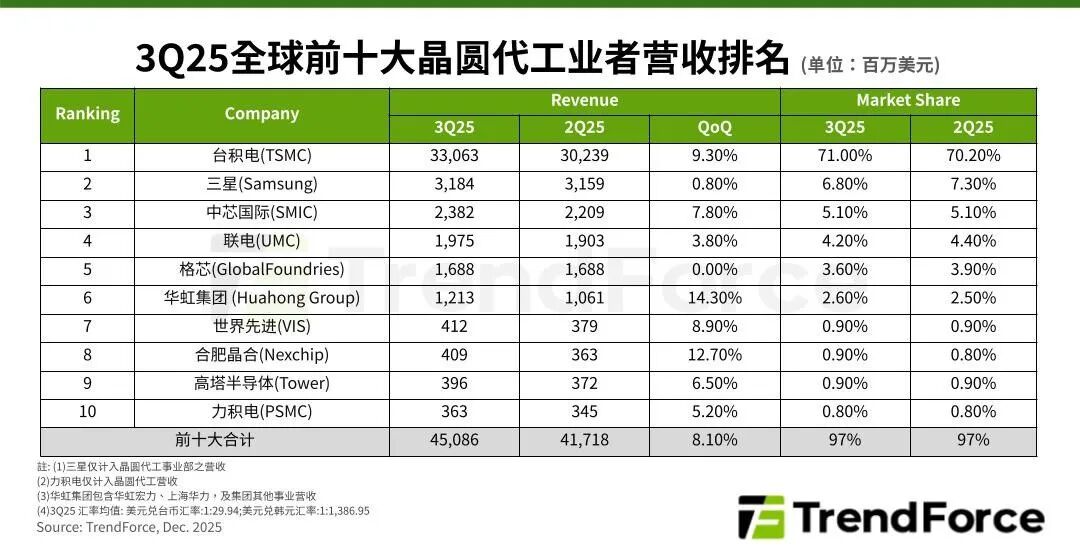 智通财经APP获悉,根据TrendForce集邦咨询最新调查,2025年第三季全球晶圆代工产业持续受AI高效能运算(HPC),和消费性电子新品主芯片与周边IC需求带动,以7nm(含)以下先进制程生产的高价晶圆贡献营收最为显著,加上部分厂商得益于供应链分化商机,推升前十大晶圆代工厂第三季合计营收季增8.1%,接近451亿美元。