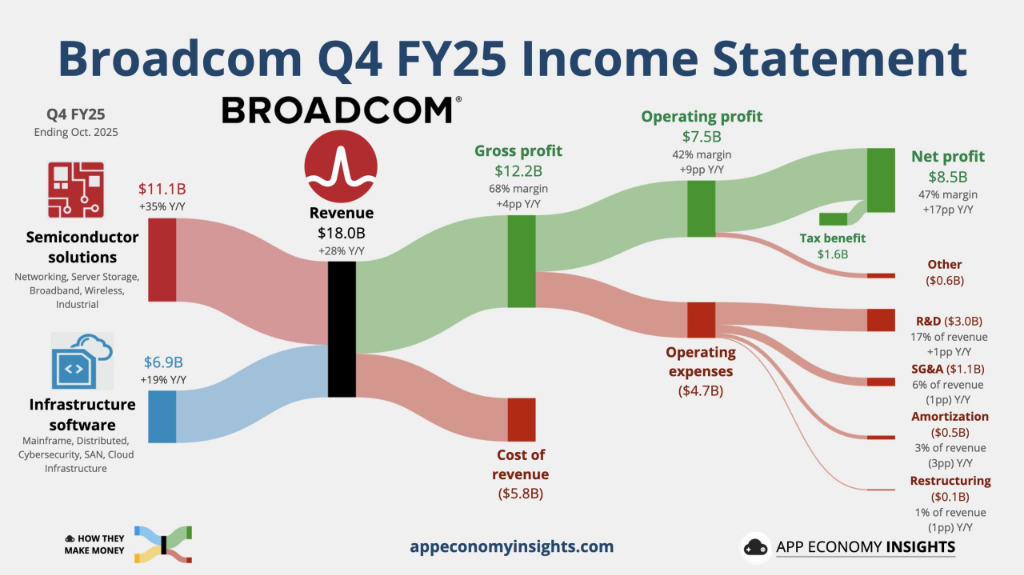 从具体财务数据来看,博通的表现全面超出高盛及华尔街的一致预期。第四财季,公司AI半导体收入达到65亿美元,高于预期的62亿美元;半导体解决方案总收入为111亿美元,高于预期的107亿美元;基础设施软件收入为69亿美元,亦小幅超出预期。