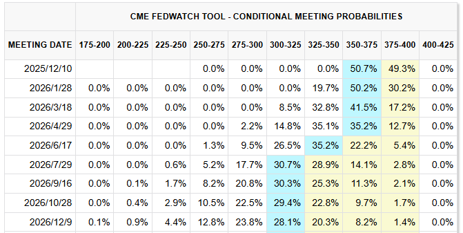 12 月再次降息的可能性降低是此次抛售的最主要原因。掉期交易员预计降息的概率约为 50%,较一周前的
