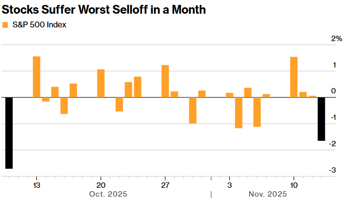 科技股的暴跌致使美国股市指数遭遇了近一个月来最大的跌幅,同时这也终结了此前连续四天的上涨态势。在主要的美国股票指数中,纳斯达克 100 指数表现最差,下跌了 2%。比特币的跌幅进一步扩大,已从 10 月份的历史高点下跌了超过了