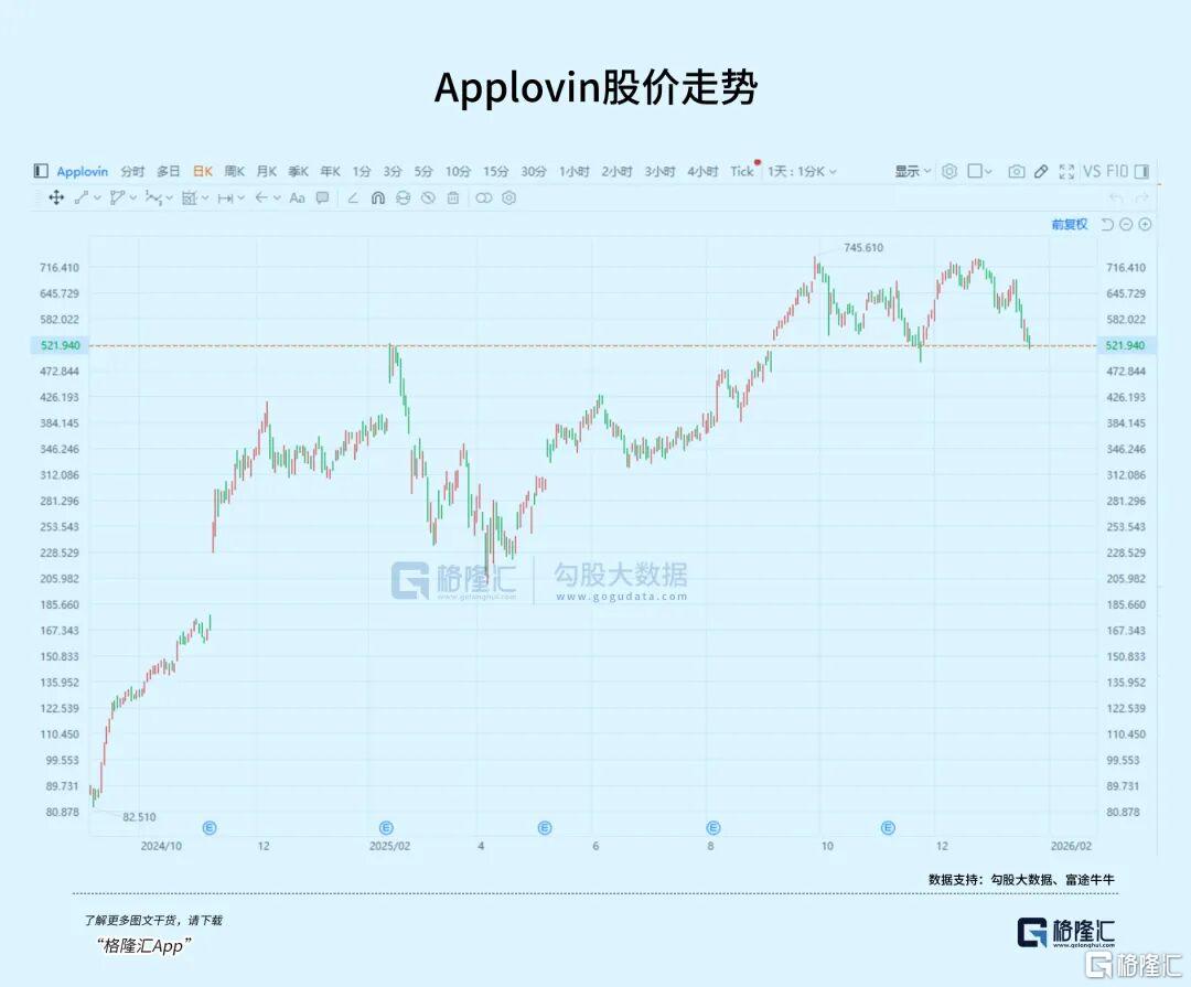 然而,就在市场情绪最为高涨的时刻,一份来自做空机构CapitalWatch的重磅报告,一下把市场热情给打下来了。2026年初,Applovin的股价遭遇了剧烈震荡,从745美元的高点迅速回调至520美元左右。