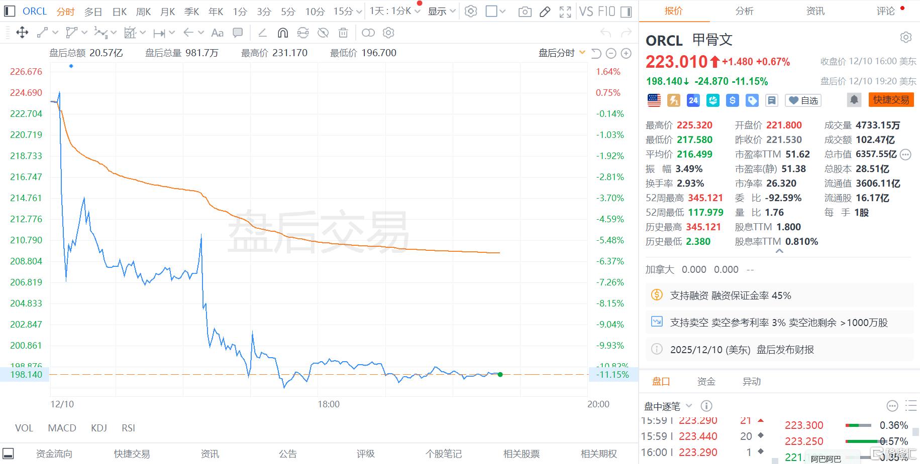美东时间12月10日盘后,甲骨文公布第二财季业绩,营收同比增14%至161亿美元(略不及预期),云基础设施收入增68%,但剩余履约义务(RPO)同比激增438%至5230亿美元。市场担忧其兑现订单需巨额资本开支,叠加五年期CDS创2009年新高,股价盘后暴跌超11%。公司年度资本开支已上调150亿美元,债务风险引发广泛关注。