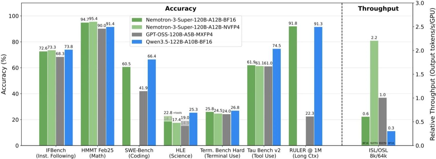 从效率指标看,Nemotron 3 Super的绝对卖点不是绝对精度碾压,而是“在相近精度下,把agent系统的推理吞吐和成本打下来”。NVIDIA 官方技术报告给出的口径是:在 8k 输入/64k 输出设置下,Nemotron 3 Super 的推理吞吐可达GPT-OSS-120B的2.2倍、Qwen3.5-122B的7.5倍;官方博客还称,它相对上一代Nemotron Super 可实现5倍以上级别的吞吐。