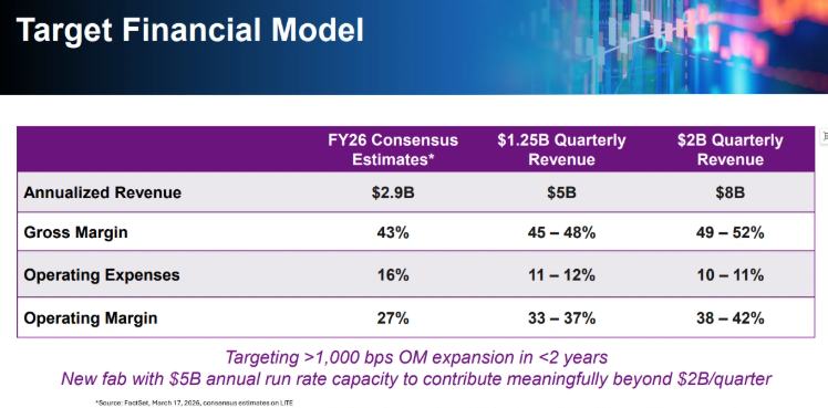 在未来9至12个月内(预计这将对应到2027财年第二季度预期或2027财年第三季度预期),该公司预计将实现12.5亿美元的季度营收运行率(年化约50亿美元),对应非GAAP毛利率中值为46.5%,非GAAP 营业利润率中值为35%。 在此之后再过9至12个月(最早对应为该公司2028财年第一季度预期,最晚为2028财年第三季度预期),Lumentum管理层则预计将实现20亿美元的季度营收运行率(对于年化约80亿美元),对应非GAAP毛利率中值为50.5%,非GAAP营业利润率中值为 40%。